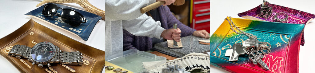 ※ コインケースとキーケースの例です。 トレイ、ミニトレイは「打刻=>染色=>形成」となります。